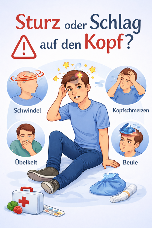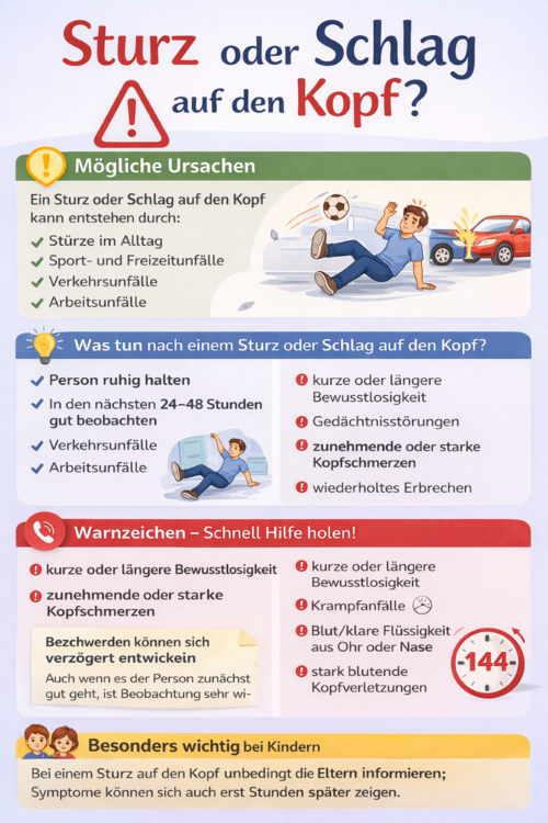 Nach einem Sturz auf den Kopf sollte die betroffene Person ruhig gehalten und 24–48 Stunden beobachtet werden.